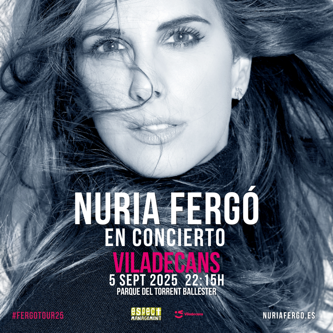 El viernes 5 de septiembre de 2025 a las 22:15h, el Parque del Torrent Ballester de Viladecans vibrará con la voz de Nuria Fergó y su banda en directo. Un recorrido por los grandes éxitos de su carrera —desde Las palabritas y Quiéreme hasta Noches de Bohemia o los míticos ‘zapatitos de tacón’— y la presentación de su nuevo single Voy a ser Feliz, una inyección de optimismo que promete emocionar al público. Una noche única para cantar, recordar y dejarse llevar por su música.